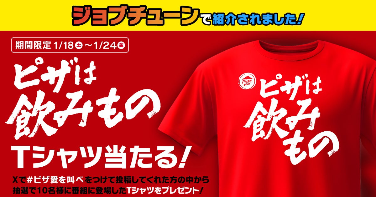 なんと、X(旧Twitter)で「#ピザ愛を叫べ」をつけて投稿してくれた方の中から抽選で10名様に、番組内に登場した「ピザは飲みもの」Tシャツが当たるようです。